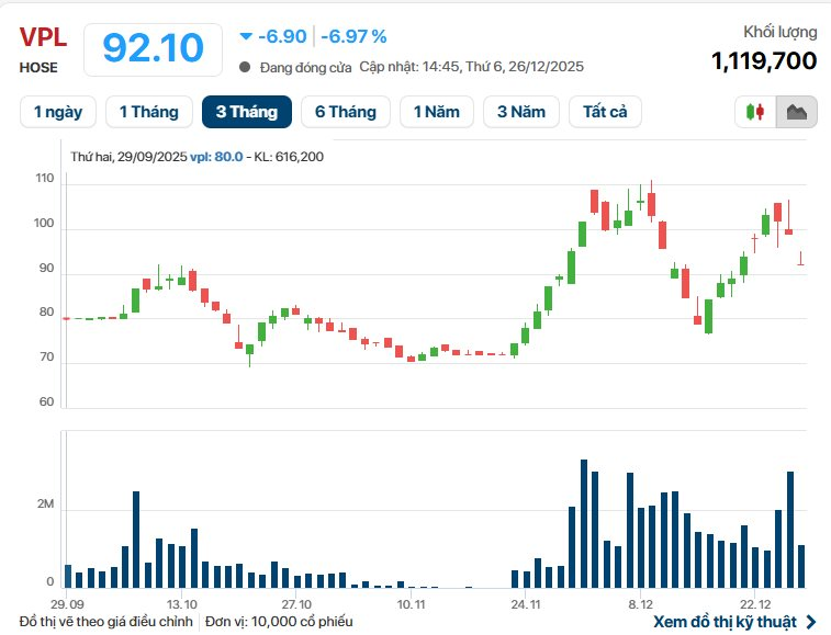Trên thị trường chứng khoán, kết phiên 26/12, giá cổ phiếu VPL ở mức 92.100 đồng/cổ phiếu, giảm sàn 6,97% so với phiên trước, khối lượng cổ phiếu giao dịch khớp lệnh đạt hơn 1,1 triệu đơn vị.