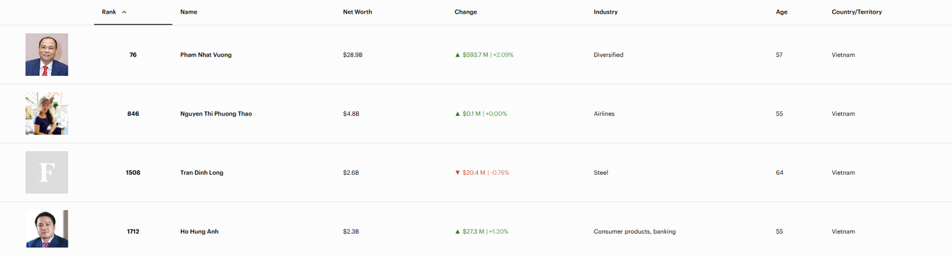 Như vậy, đến cuối năm 2025, Việt Nam có 5 tỷ phú USD , gồm ông Phạm Nhật Vượng, bà Nguyễn Thị Phương Thảo, ông Trần Đình Long, ông Hồ Hùng Anh và ông Nguyễn Đăng Quang. Ông Trần Bá Dương không còn xuất hiện trong danh sách.