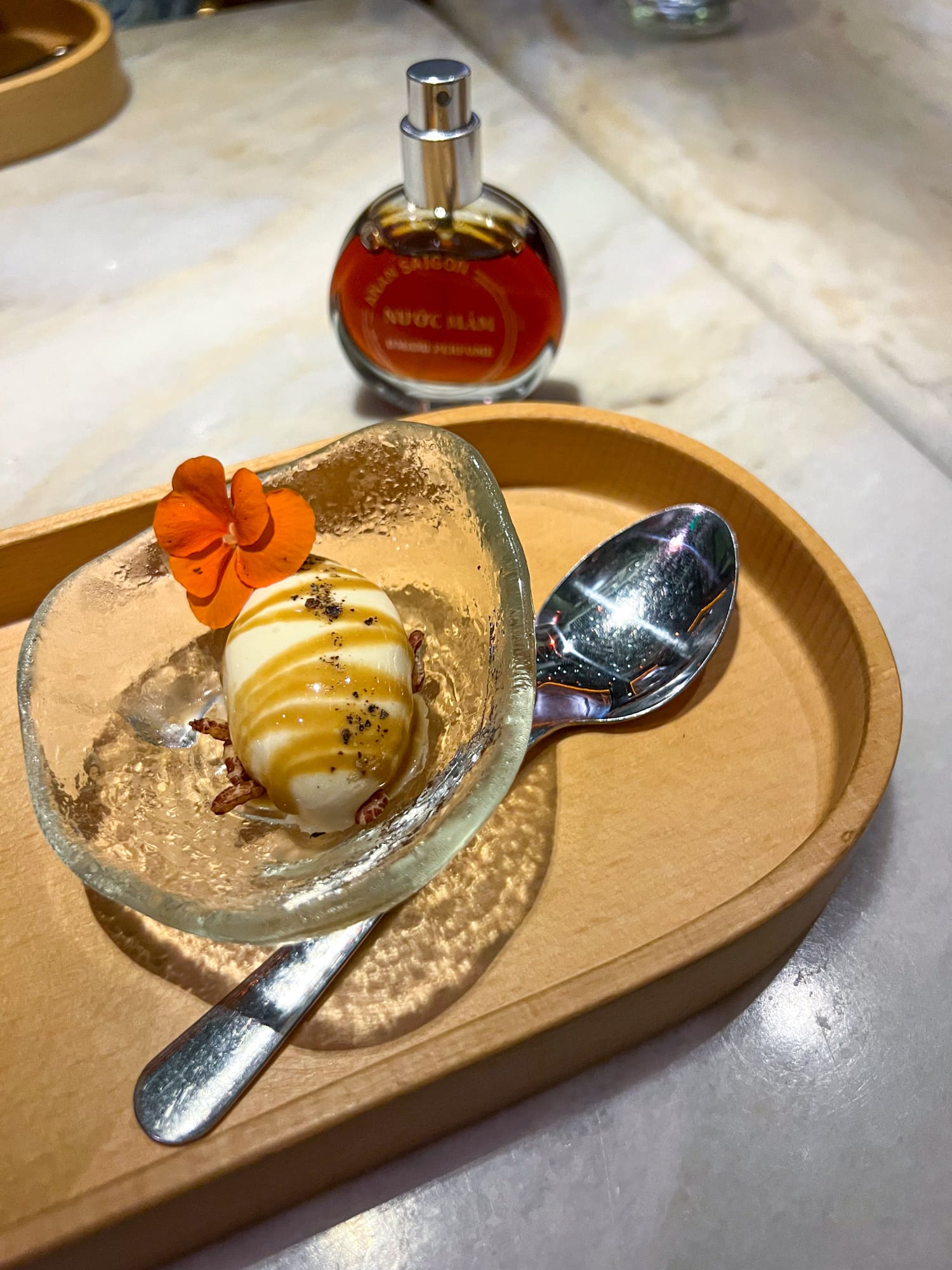 Kem vani Pháp phủ sốt caramel nước mắm và tiêu đen nghe có vẻ lạ, nhưng lại rất ngon. Một chút nước mắm tạo nên nét tinh nghịch cho món tráng miệng đặc trưng. Đầu bếp chia sẻ rằng món tráng miệng này “được lấy cảm hứng từ món bơ mặn và thịt kho tiêu đen của Việt Nam.”
