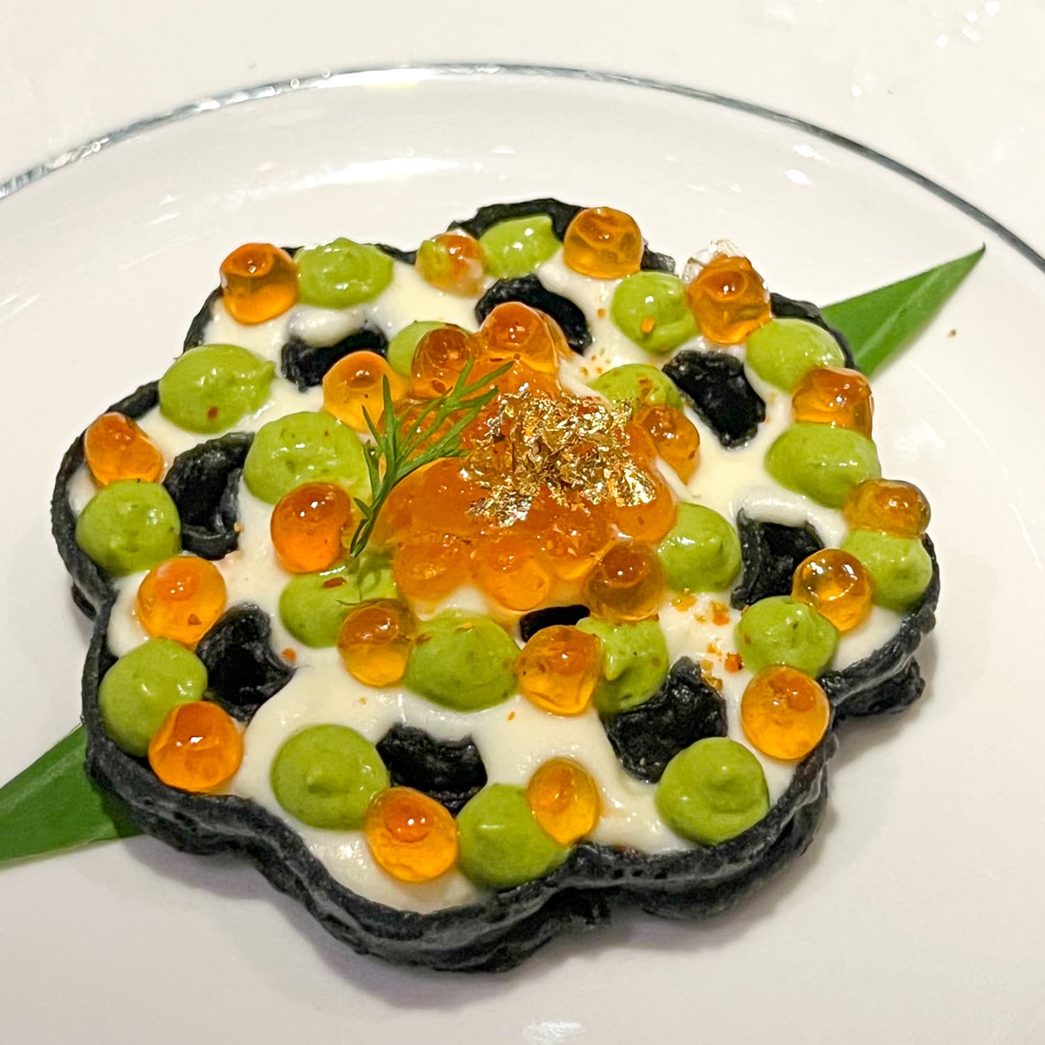 Cá hồi là nguyên liệu chính của món thứ ba, được lấy cảm hứng từ bánh waffle truyền thống của các quán ăn vỉa hè Việt Nam. Cách trình bày hấp dẫn được mô phỏng theo bánh tart truyền thống của Pháp. Vỏ bánh làm từ bột gạo và trứng, phủ trứng cá hồi muối, cá hồi hun khói, kem tươi và kem thì là. Bánh còn được trang trí bằng vàng lá ăn được để thêm phần lấp lánh. Đó là một điểm nhấn khác, và dù tôi đã rất cố gắng, bức ảnh trên vẫn chưa lột tả hết được sự tươi ngon của món ăn đặc trưng này.