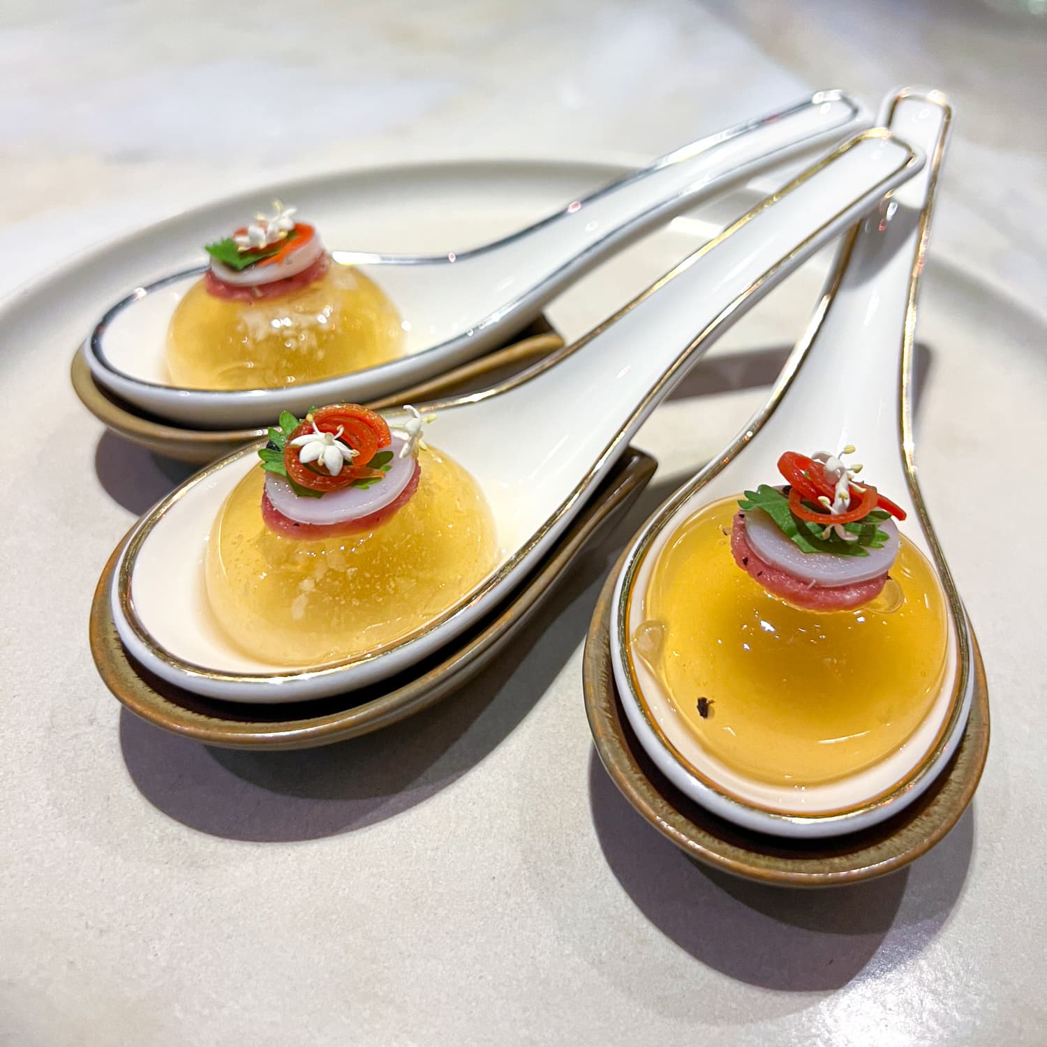 Ferran Adria (một đầu bếp nổi tiếng người Tây Ban Nha, được coi là cha đẻ của lĩnh vực ẩm thực phân tử) đã phát triển quy trình tạo cầu để giữ nước dùng trên thìa tại El Bulli, nhà hàng nổi tiếng (đã đóng cửa) của ông trên bờ biển Costa Brava, Tây Ban Nha. Trải nghiệm đầu tiên của tôi với những khối cầu phân tử này là tại nhà hàng Bodega 1900 của anh trai ông, Albert Adria, ở Barcelona. Chúng mang đến một trải nghiệm với hương vị bùng nổ nhanh chóng và thú vị, và kỹ thuật này không phổ biến. Vì tất cả những lý do này, đây là một trong những món ăn mà tôi yêu thích nhất.