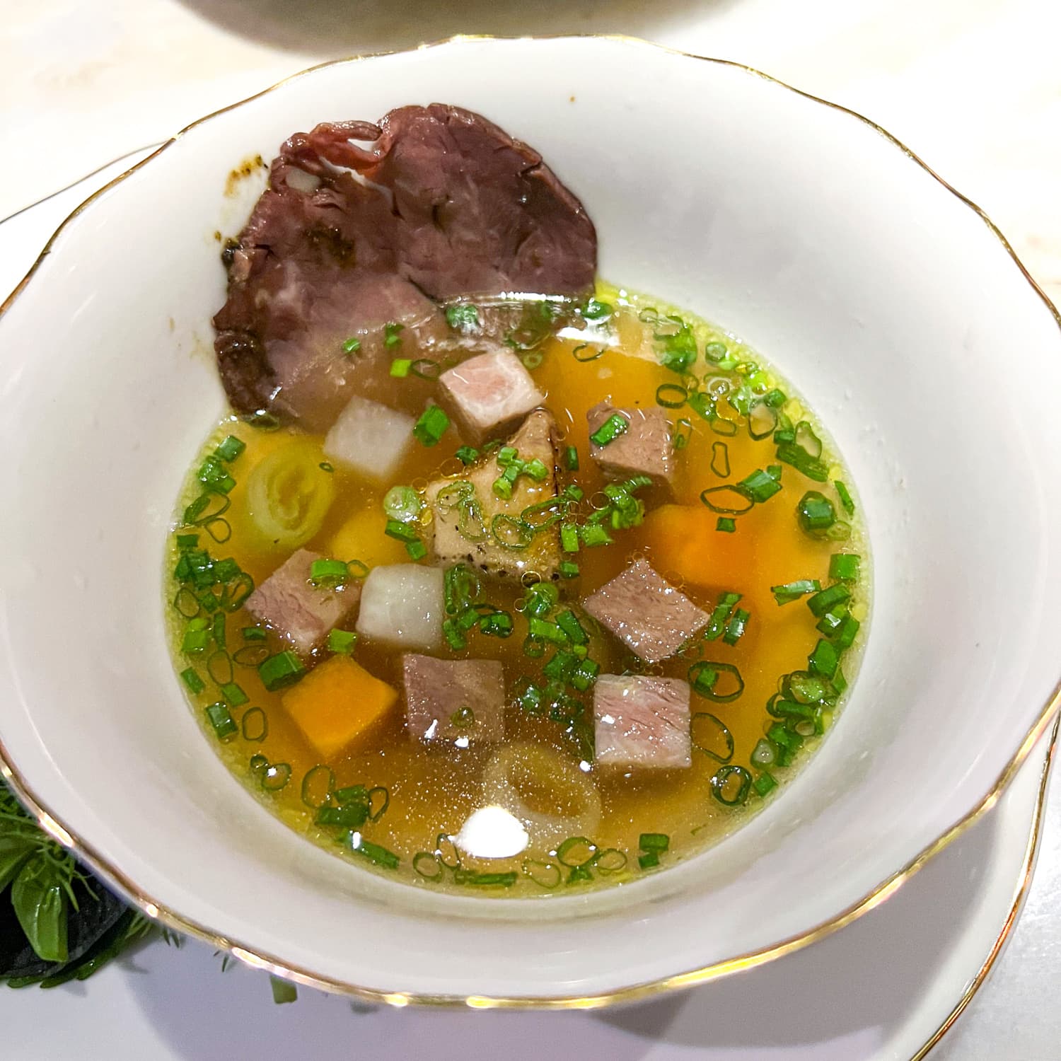 Nói về phở, món ăn Việt Nam trứ danh xuất hiện rõ nét hơn ở món chín tại nhà hàng này với cái tên Pot Au Phở – một cách chơi chữ lấy cảm hứng từ món bò hầm kiểu Pháp (pot-au-feu) kết hợp với từ “phở” để tạo ra cái tên mới, thể hiện sự giao thoa văn hóa Pháp-Việt. Món Pot Au Phở được chế biến từ nước dùng consomme (một loại nước dùng được chế biến từ nước dùng cơ bản, làm trong bằng cách sử dụng lòng trắng trứng để lọc các cặn bẩn), thịt bò wagyu và gan ngỗng. Khác với món phở truyền thống dùng sợi mì dài và mỏng, phiên bản này dùng sợi mì tròn.