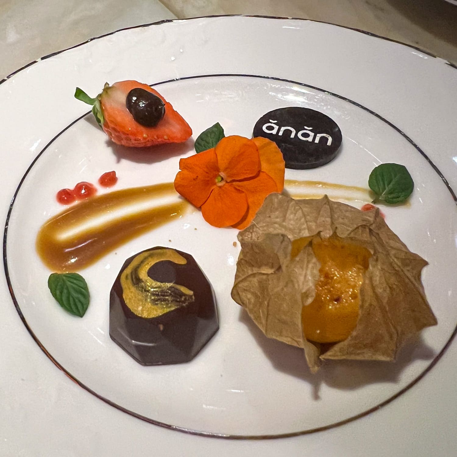 Bữa tối của chúng tôi tại nhà hàng được chúng tôi đánh giá là “ngon nhất Việt Nam” kết thúc bằng một đĩa bánh tráng miệng (petit fours). Sô cô la Marou lại xuất hiện dưới dạng kẹo sô cô la. Ngoài ra còn có dâu tây với kem tỏi đen và quả đèn lồng nữa.