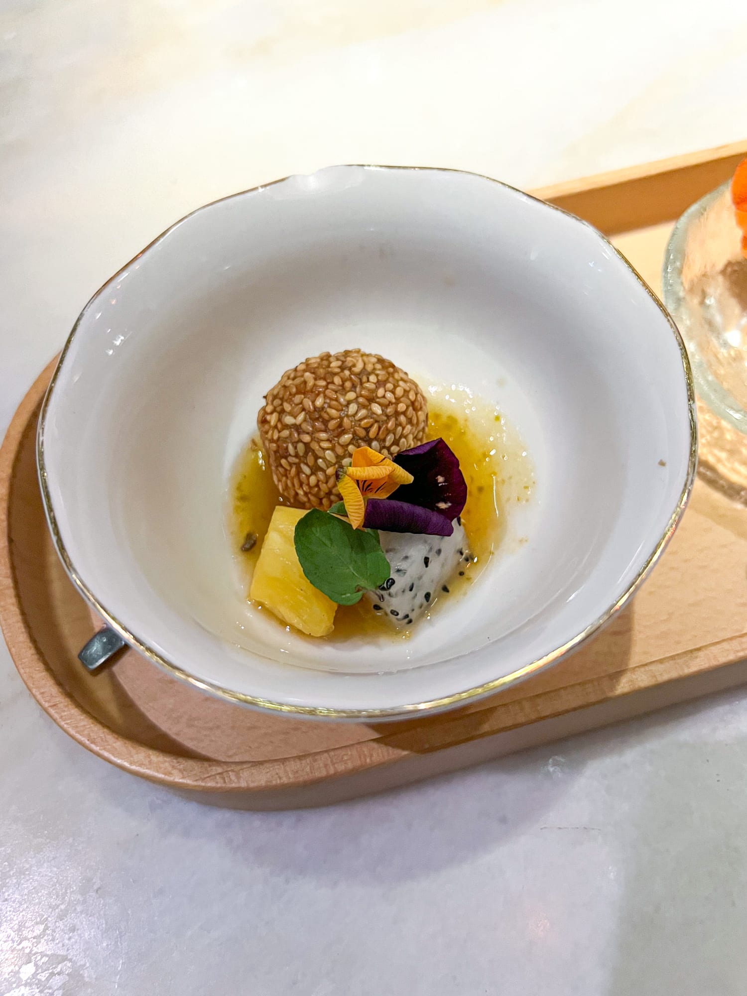 Kem được phục vụ kèm một món tráng miệng truyền thống hơn của Việt Nam, đó là món bánh cam (người miền Bắc gọi là bánh rán vừng). Phiên bản này có sô cô la đen Marou nguyên chất (70% cacao) và sốt gừng calamansi. Kem được phục vụ kèm dứa tươi và thanh long. Kel và tôi đã trở thành fan của Marou Chocolate (một thương hiệu sô cô la cao cấp của Việt Nam) sau khi ghé thăm quán cà phê hàng đầu của họ tại Sài Gòn, Maison Marou, vào đêm đầu tiên ở đây. Sau đó, khi đến Hà Nội, chúng tôi đã mua vài thanh sô cô la của họ để mang về làm quà, nhưng tất nhiên, chúng chẳng để được lâu!