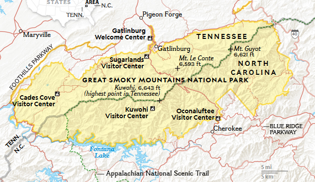 Kuwohi, trước đây gọi là Clingmans Dome, là điểm cao nhất của công viên và mang đến góc nhìn biểu tượng nhất. Tên gọi gốc của ngọn núi đã được khôi phục để tôn vinh mối liên kết sâu sắc của người bản địa với nơi này.