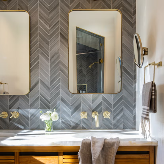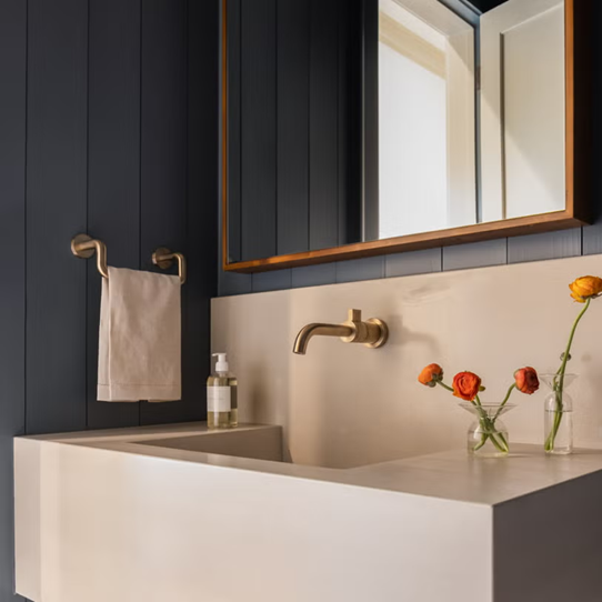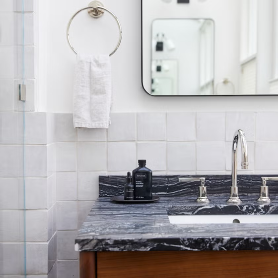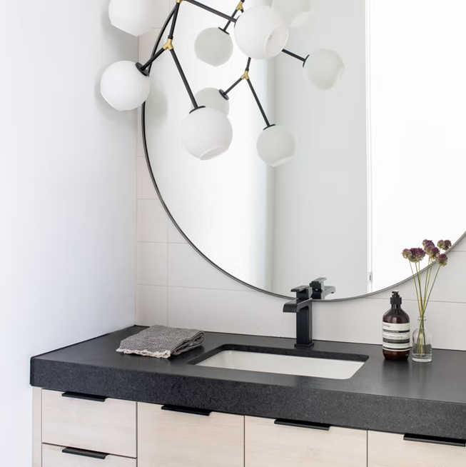Được ví như “chiếc váy đen nhỏ” của mặt bàn phòng tắm vì linh hoạt, dễ ứng dụng cho cả phòng tắm chính lẫn phòng tắm trẻ em. Chất liệu này bền, cá tính, nhưng cần phủ lại mỗi năm một lần.